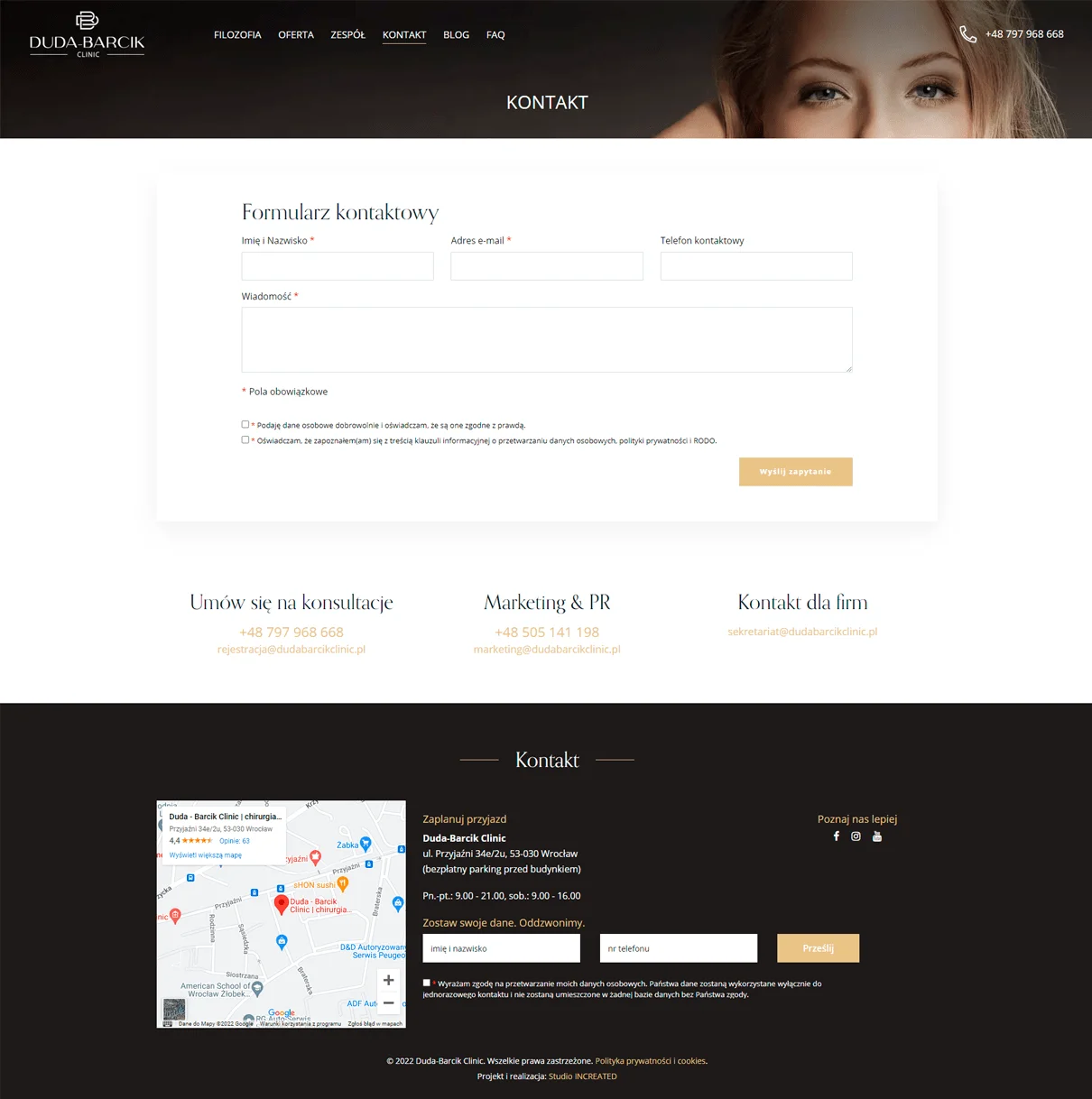 Dla kliniki Duda-Barcik z Wrocławia wdrożyliśmy dedykowaną stronę firmową wraz z systemem zarządzania. Głównym założeniem projektowym było stworzenie koncepcji minimalistycznej, ale utrzymanej w konwencji luksusu i piękna.